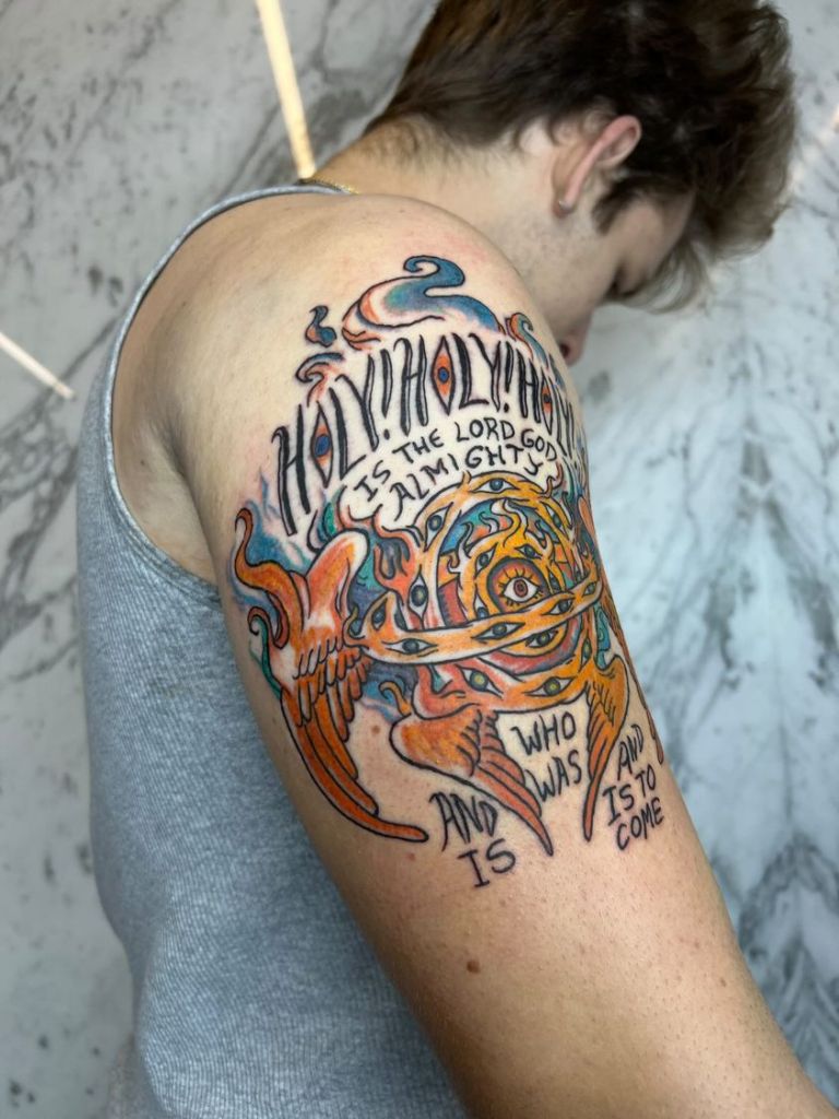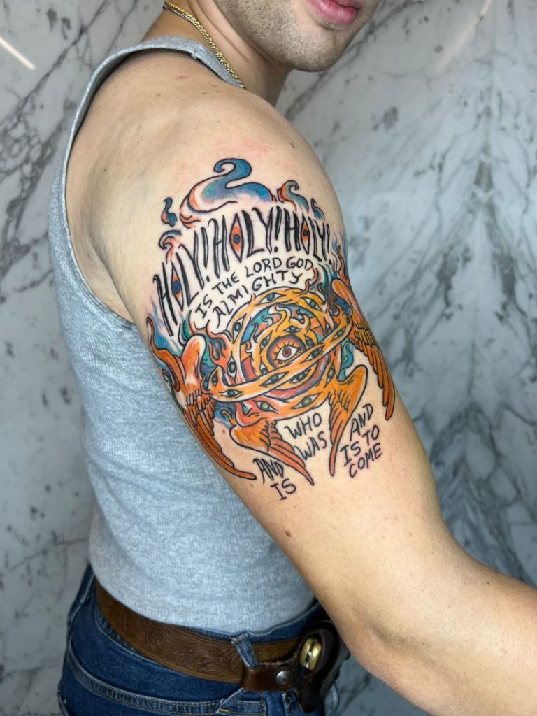 An angel tattoo commission I completed last month! The commissioner was wanted something that combined text and artwork. The verse is from Revelation 4:8, the lines sung by the four living creatures, and the imagery is inspired by the ophanim of Ezekiel.