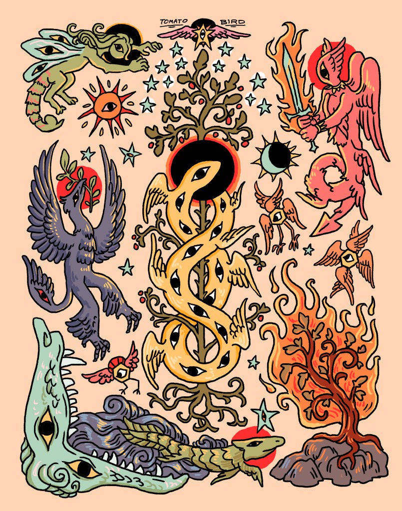 A print I made for the 2024 SF Zinefest! It’s inspired by my various tattoo design work over the years. For the theme, I wanted to do something with lots of angel designs of course, with a lot of these inspired by various Old Testament creature mentions—Rahab, seraphim as serpents, etc—and some little reference to evolutionary creatures as well, like the tiktaalik and microraptor, which are some of my personal favorites. Of course, the hexagonal angels are my own little signature creatures that are not necessarily references to anything, but I always love to include as well.