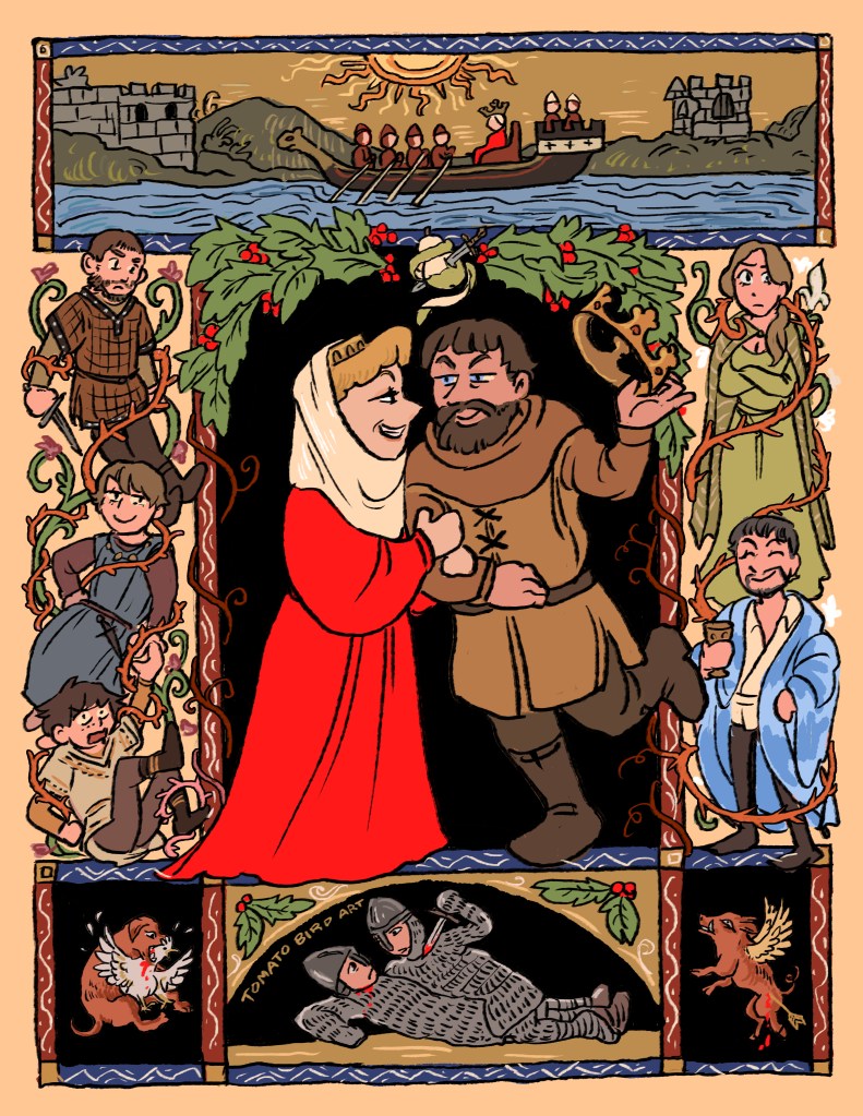 The movie has a very particular look; we have shots of the actual Chinon castle and its surrounding environment, but the rest of the places where drama takes place are very bleak, dirty, and lived in, with occasional spots of dramatic color amongst the dirt, straw, and animals. It’s a great setting to tell a story about a bleak and unwelcoming family and holiday time, but as many have pointed out, the medieval times were an immensely colorful time in terms of the material culture, clothing and decorations. For this illustration I wanted to incorporate the movie’s designs combined with some of the maximalist looks of contemporary medieval manuscripts. One thing I love about medieval manuscripts is the cartoony and stylized figures; its easy to incorporate modern cartooning into that look as well. The main difference is for most medieval figures they aren’t necessarily meant to be expressive in the facial expressions, while for me, that’s my favorite part!
